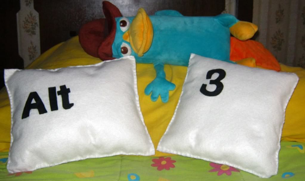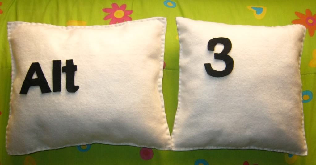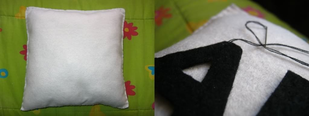 La almohada fue rellena y terminamos de coser, ahora sigue colocar las letras. Tan simple como copiarlas de un teclado cualquiera en fieltro negro y recortarlas. Puedes coserlas o pegarlas con resistol.