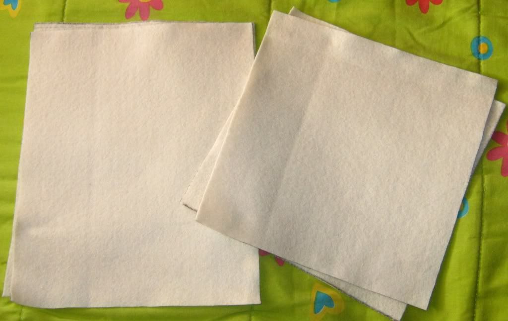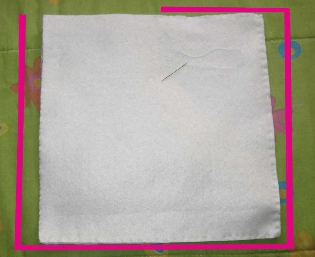 Primero hay que cortar dos cuadros de fieltro blanco de 25 x 25 (o de 30 x 25, según la tecla que sea)